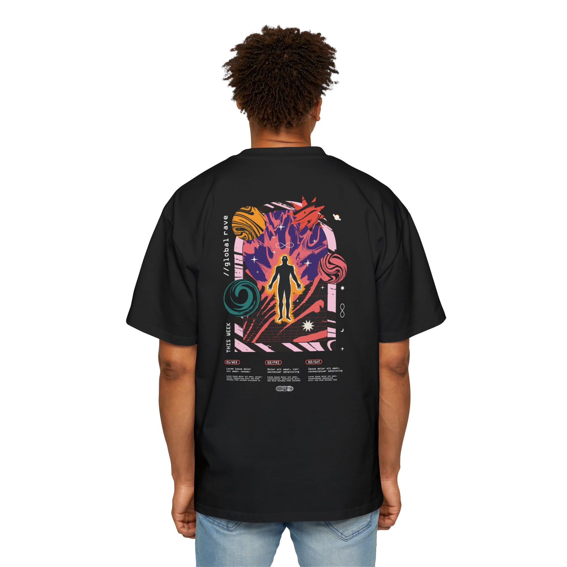 This vibrant graphic tee captures the energy of a cosmic rave experience with bold, futuristic design elements. The back features an eye-catching print that blends neon colors with abstract shapes, a silhouette of a person amidst swirling galaxies and candy-like motifs, creating an otherworldly vibe. The text on the shirt hints at a weekly adventure in a global, electrified universe. With its unique blend of colors, pop culture references, and energetic theme, this shirt is perfect for those who embrace the fusion of art, technology, and music. A must-have for rave enthusiasts and trendsetters alike!